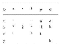 Međutim, Sana Koranci pokazuju da je bilo još mnogo odstupanja koja nisu prepoznata u varijantnoj literaturi, ali koja se, ako se ponove, više ne mogu diskreditirati kao lapsus kalami, već prilično vrijedne reference na rani Koran -Arabic može dati! Postupak će ovdje biti ukratko opisan: U okviru (a) na Sl. B. dyvb Nkm N- m (Q 34:53) da biste uskoro pročitali minma ka n o, ali samo su slova podebljana u prepisu. Posljednja riječ dyvb je previše dvosmislena da bi se mogla protumačiti bez konteksta; ispravna interpretacija uskoro će biti uokvirena u sljedeću tablicu, mnoga druga teorijski moguća tumačenja skripte navedena su pod ispravnim tumačenjem: